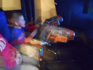 The 2nd day, Kyla got brave enough to go down one of the enclosed slides with Kim. She wasn't too sure about them the first day and she was still kind of nervous but she did it and she liked it. It is all dark going down the tube and then it takes you to a circle which is all lighted up for several loops around and back down the dark tubes again. Apparently when they slid out of the tubes at the bottom, their tube flipped over and I don't think she was a big fan of that happening!! LOL The tubes were alot of fun. Everyone was swam out so we changed and headed home but....you cant leave until you play the arcade games. Ignore the fact that of what they spent on tickets to play the games, you could have gotten the prizes at the party store for .25 LOL but.....then I guess they wouldn't experience the fun of game playing!!
